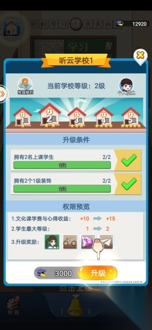 点击游戏主页面左上角的“校园”图标即可进入。当前界面会显示有相应的升级条件和权限预览,在升级奖励中有几率出现学生奖励,不需要额外消耗资源,是前期比较推荐的学生获得方式哦~