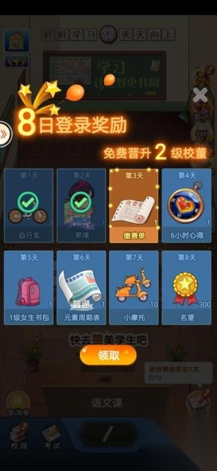 点击游戏页面右边的“8日登录”图标即可进入。累计登录2天,即可获得精英学生罗淳。累计登录7天,还可领取10个小摩托道具,小摩托十连走必得一位精英学生。有了精英学生们的加持,各位校长的学校定会大放异彩!