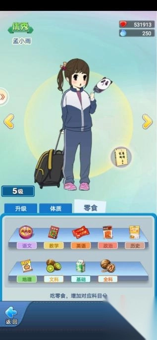 技巧总结:考虑到前期考试时,只能一人考试且需要满足相应分数才能三星通关的特点,建议新手期通用零食来培养学生最优单科成绩为主,单科高分追求考试的迅速通关。
