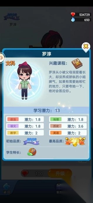 除了可以进行学生升级外,还可以通过保健室(主页面点击走廊-保健室,选择想要升品的学生)进行学生升品,实现学生的全面均衡发展~
