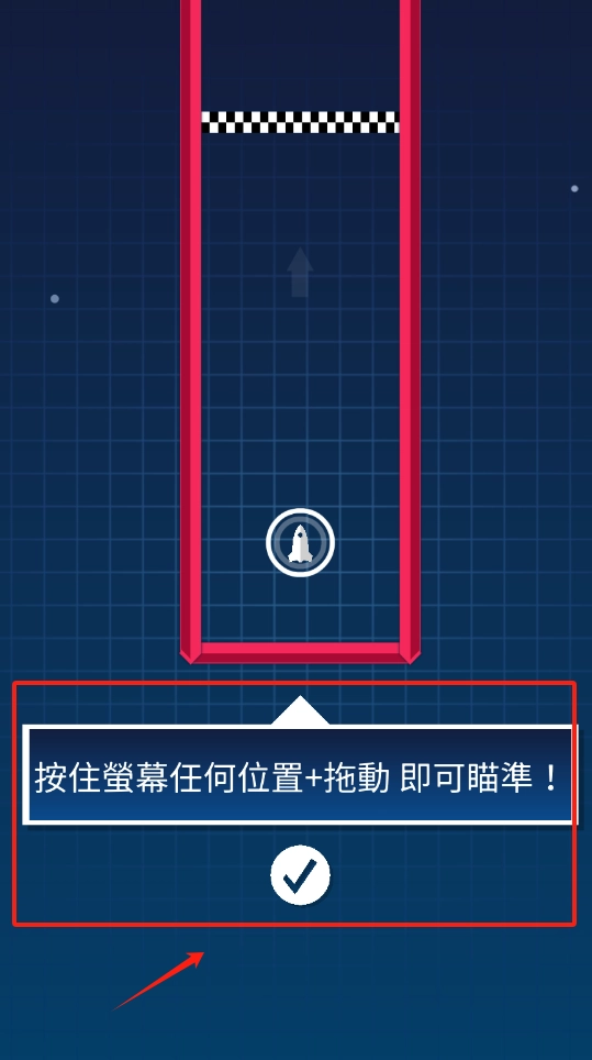 2、按住屏幕任意位置拖动来瞄准火箭发射方向,对准后点对勾发射。