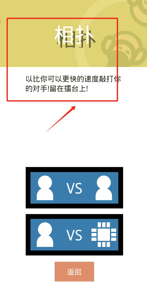 3、当看到“相扑”这两个大字时,迅速用手指点击屏幕来击打对手,千万不能让对手把你击出红色边框的擂台。要是想回到上一级菜单,点击“返回”即可。
