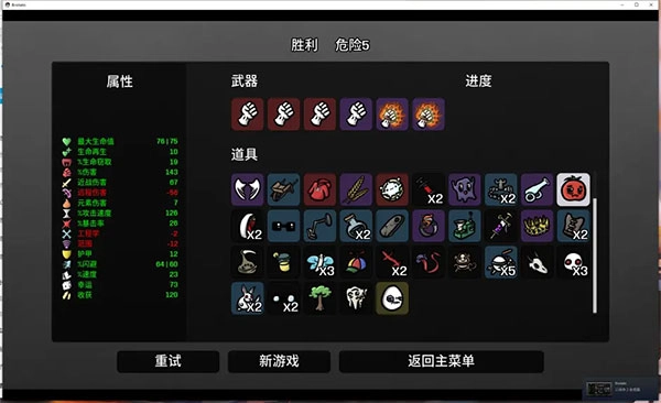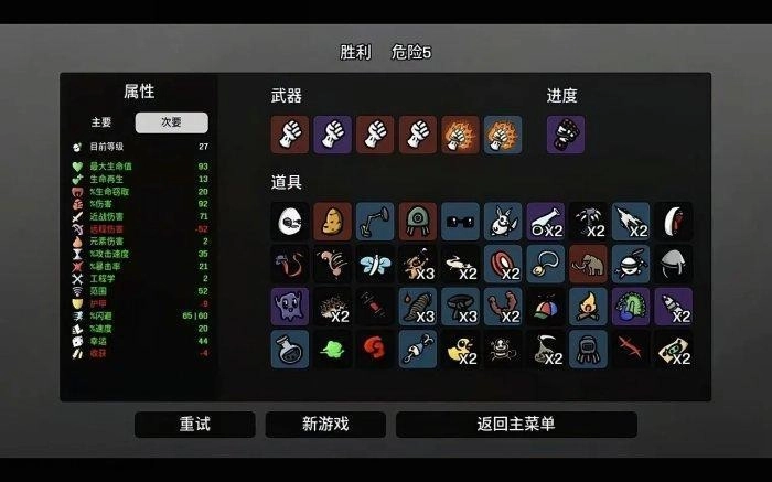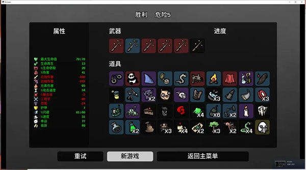 思路和游侠相近,只要伤害足够,就能体验到极致的畅快。前期主要堆叠远程伤害与收获属性,后期若刷到紫色机关枪,换或不换可依据自身经济状况来定。到了中后期,则着重堆叠百分比伤害、暴击率(达到约50%就行)、护甲以及速度。特别提醒,要堆一定的范围属性,但不用太高。要是刷到道具长胡子的婴儿(死亡爆炸子弹)、头巾(额外穿透)、南瓜(穿透伤害),毫不犹豫地拿下,还有其他远程类的提升道具也别错过。当然,生存所需的基本三项——生命值、护甲、闪避,同样不能忽视。