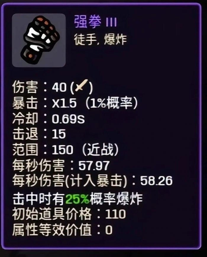 武器方面,可选择拳、烈焰黄铜指虎以及强拳。当选用后两种高级武器时,无需刻意去堆叠元素伤害、爆炸伤害以及范围伤害。在前期,属性优先选择近战伤害、移动速度以及收获。由于徒手武器本身有15%闪避加成,再加上人物自带的15%闪避,闪避效果较为可观。而且拳类武器击退效果强,要是伤害不足,很容易吸引大量怪物聚集,进而导致角色突然死亡。 到了游戏的中后期,生存属性的优先级为闪避>护甲>生命窃取>生命再生。对于范围属性,建议将负收益调整到正收益即可,这一点至关重要。暴击属性可以适当堆叠,而攻速属性的收益并不高。道具方面,强烈推荐软糖狂战士、眼镜、精湛技艺、仪式、Retromation的连帽衫以及猛犸。