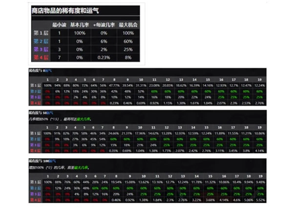 ⑥幸运这一属性的解释较为复杂,其核心数据遵循乘算机制。商店中的道具,会依据回合数的增加,通过加减机制逐步提升,但不会超过特定最大值。除了【幸运儿】这个特殊职业外,我建议按照0 - 50 - 100这三个数值来堆叠幸运属性。较高的幸运值,能促使商店提高刷新高品级道具与武器的概率,并且在击杀小怪后,掉落回血道具的几率也会更高。【这能让你少堆叠一些生存向属性,多堆叠伤害属性】,从而助力你更轻松地通关。当然,要是你是欧皇,可无视此条建议。数据党可参考下图: