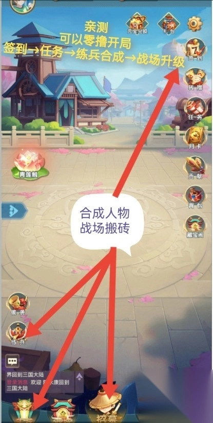 1、零撸起步路线:每天完成签到和任务,借助练兵合成基础武将,迅速积攒初始元宝。