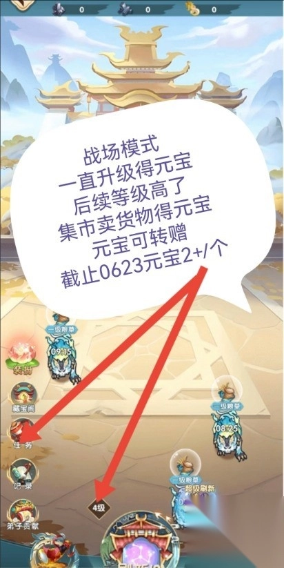 1. 可借助战场升级、集市售卖物品来获取元宝,元宝支持转赠交易,即便不充值,也能够积累资源。