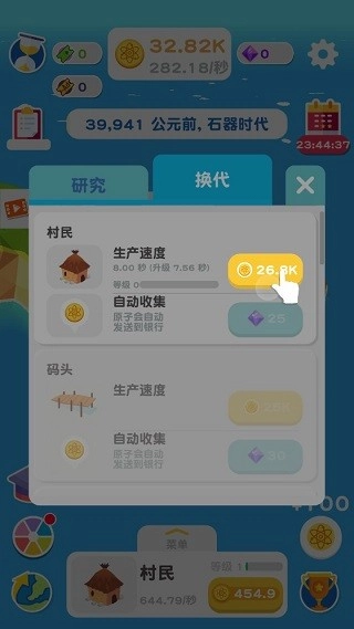 5、当您进入当前界面后,点击“换代”选项,随后在此处就能进行升级操作。升级对应的建筑,能够提升原子的生产速度。