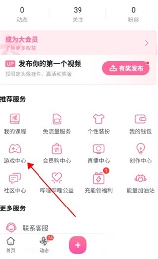 1. 先下载哔哩哔哩app并打开,接着在“我的”页面里点击“游戏中心”。