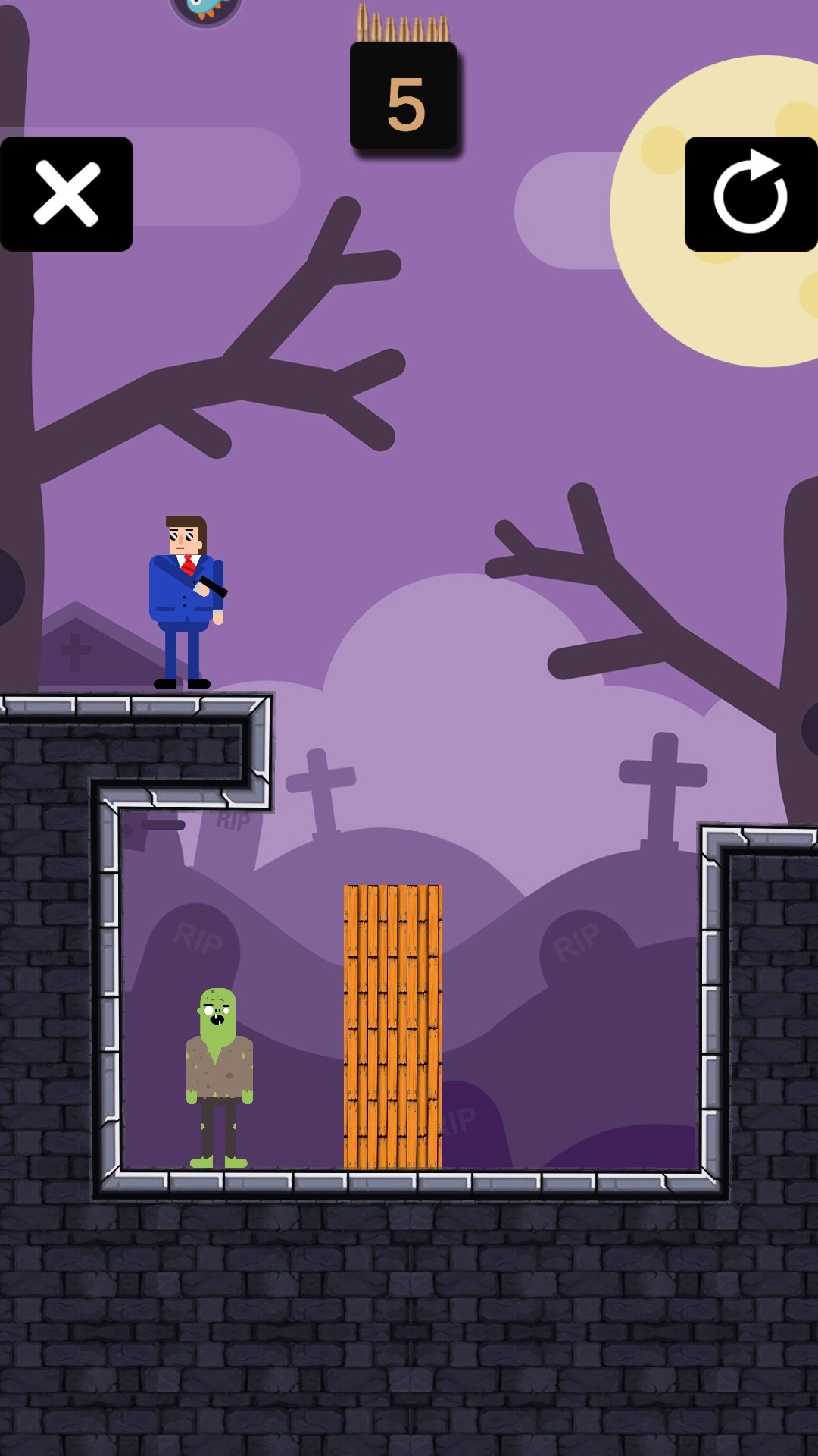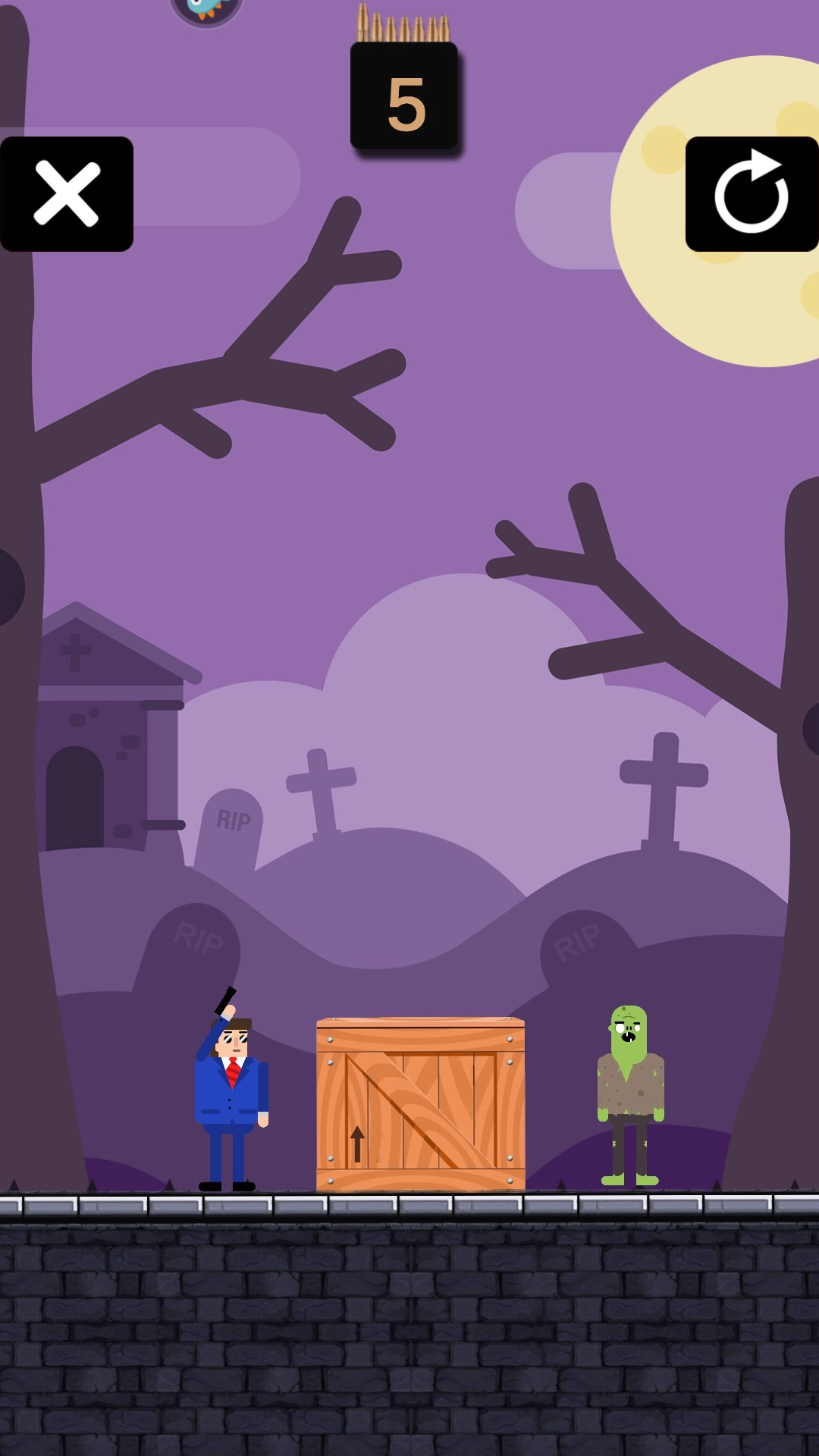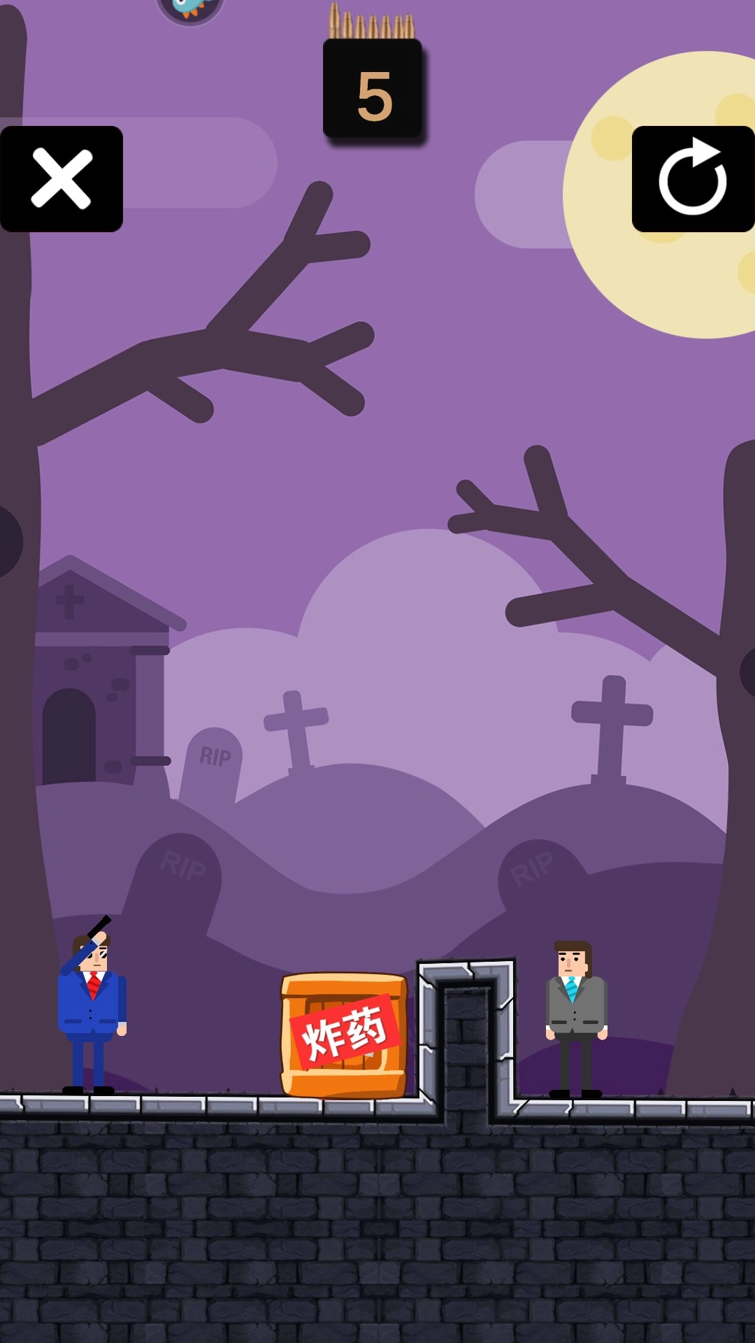 2、这一关有障碍,玩家需要利用墙壁反弹子弹射中模板砸到敌人。