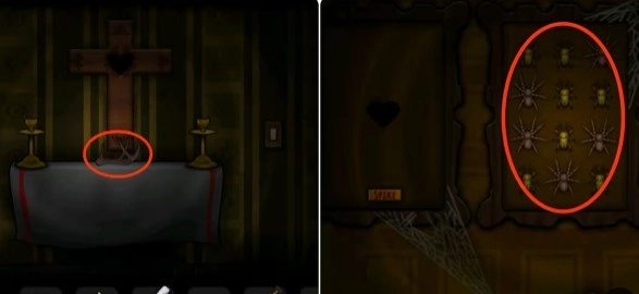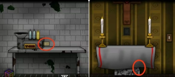 进入实验室根据旁边信封里的提示打开机器并放入鱼获得纸条,再到十字架处拿走桌布下方的银色十字架。
