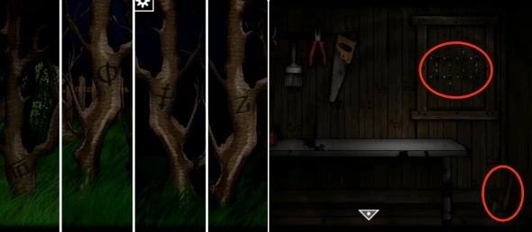 走进后院,留意树干上符号所在的三个场景,凭借这些符号开启工具房的木门。进入房间后,取走桌上的地图以及墙角的斧头,随后打开上方的机关暗格,获取栅栏钥匙。