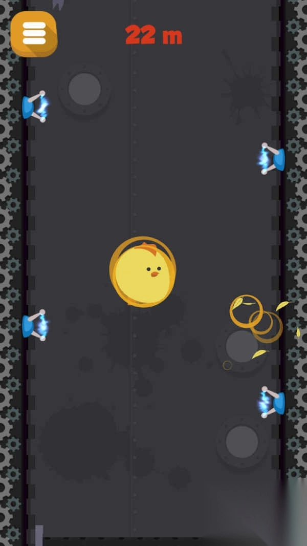 2、在游戏里,依照箭头的指示,点击屏幕使小鸡起跳,收集金币,躲开两侧的电击装置,向着更远的距离发起挑战(目前距离为22m)。