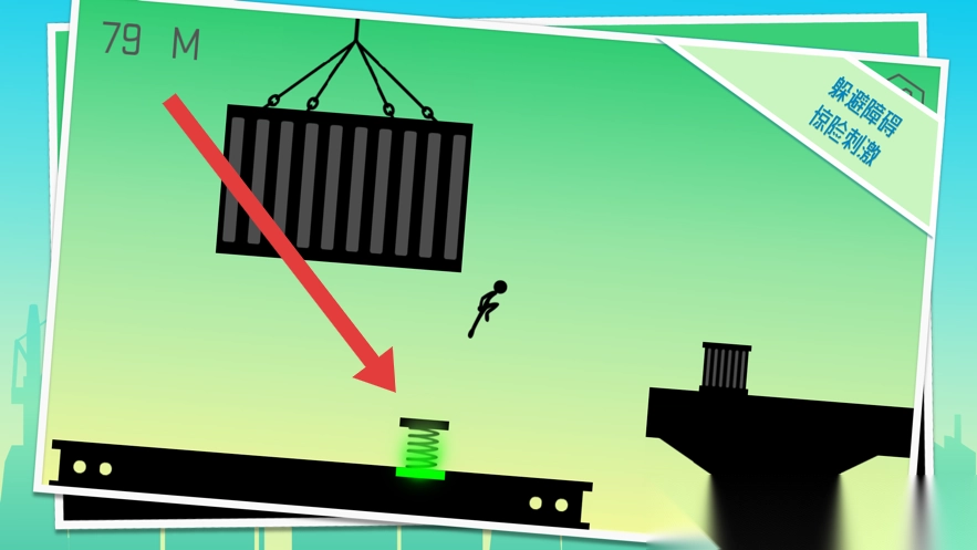3、看到弹簧道具(绿色发光),引导火柴人跳跃触发,借助弹力越过深坑等障碍,挑战更远距离。