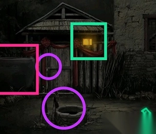 密码打开门,得到道具装在水井上。查看灯笼线索。粉色方框缸内有虫子。