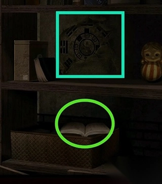 9、移步到右侧书架,第二层有个阴阳镇,按照灯笼上的提示打开,取到照片