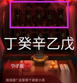 3、移步入破观,墓碑上的提示和书本上的提示排序,得到拨浪鼓(己和乙需要分清楚,别搞错咯~)