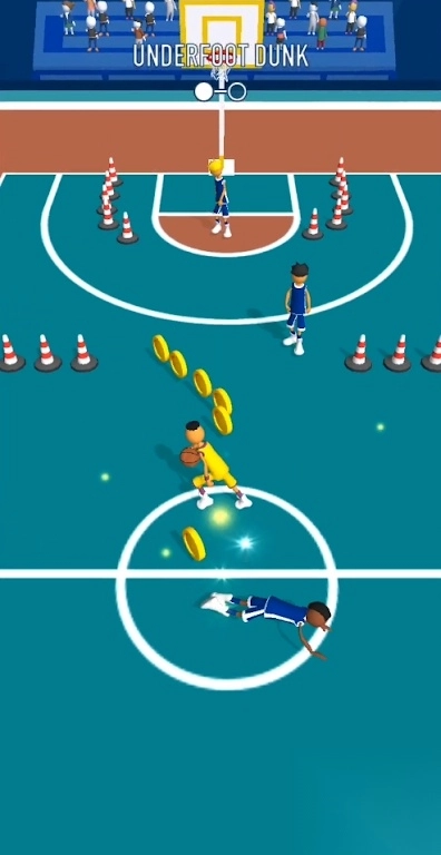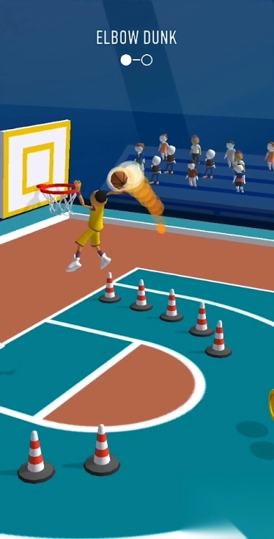 1. 扣篮挑战于球场进行,操控身着黄衣的球员,躲避诸如锥桶、防守者这类障碍,同时收集金币,进而完成“ELBOWDUNK”“UNDERBASKETDUNK”等特技扣篮动作。