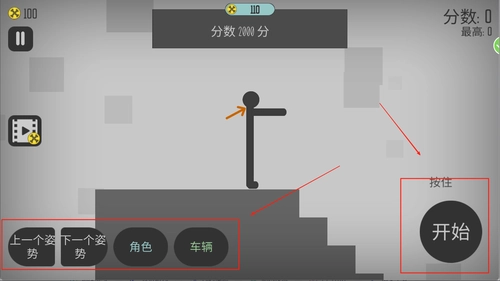 1、驾驶滑板、购物车、摩托车、汽车甚至火箭,以不同方式让火柴人摔得更惨,体验不一样的破坏快感。