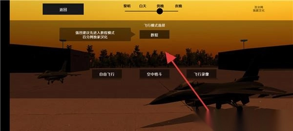 2、开启“傍晚”模式后,若选择“教程”,可学习起飞、空战以及降落的相关知识;若选择“自由飞行”或“空中格斗”,则能通过实践操作来提升驾驶技巧。