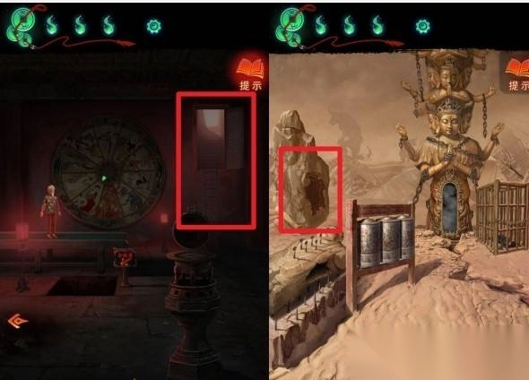 1、在室内轮盘场景与沙漠佛像场景,点击红框标记的互动区域,调查获取线索或道具。