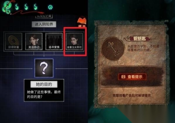 2、任务分支选择【金童玉女祭祀】,查看【铜钥匙】提示(完整观看广告解锁),推进解谜流程。