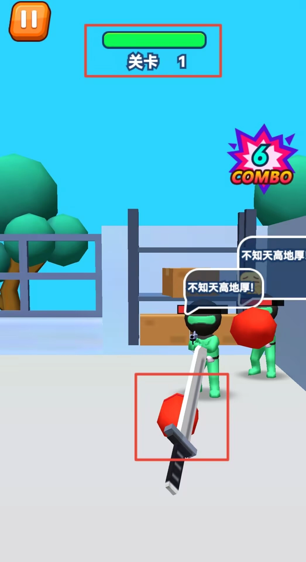 2、游戏采用回合制战斗模式,敌方先行攻击玩家需格挡,随后切换至攻击回合,界面顶部显示当前关卡进度。