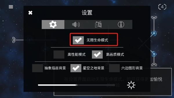 3、接下来点击进入设置界面,把无限生命模式开启,这样就能获得更愉悦的游戏体验。