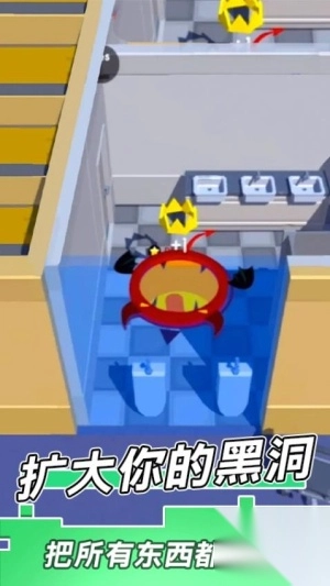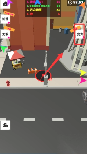 3、随着黑洞变大,尝试吞噬场景中的建筑物获取更多资源。关注排名变化,在关键时刻发起进攻争夺第一名的位置。
