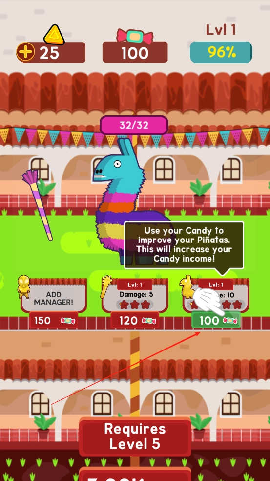 1、点击屏幕对皮纳塔发起攻击,收集掉落的糖果,收集得足够多可以升级技能,根据提示升级之后,击打皮纳塔收益会更高。