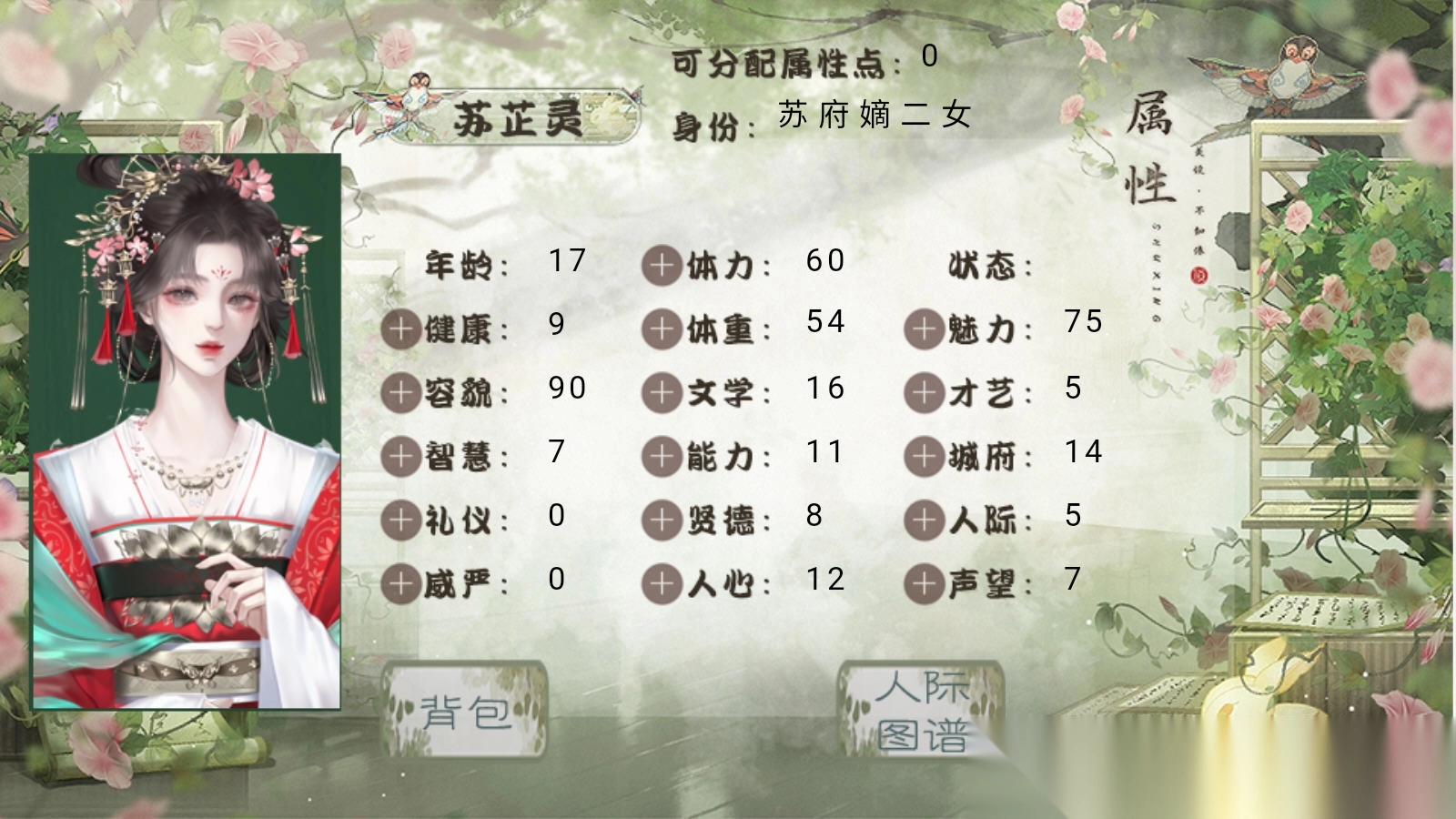 1. 苏芷灵,17岁,徽州苏府嫡二女。性格兼具柔顺与泼辣两面,生辰为8月26日,生母是苏段氏。