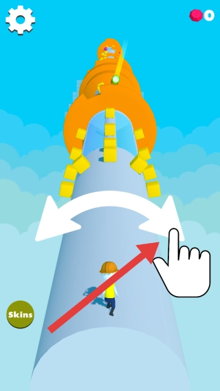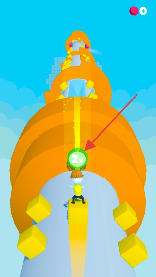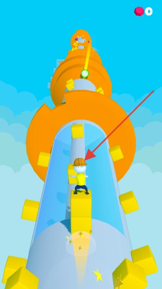 1、操控戴安全帽角色,沿螺旋赛道前行,按左右箭头指引,避黄色方块,向高处推进,收集道具。