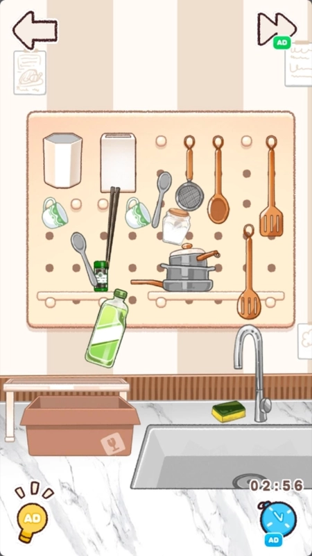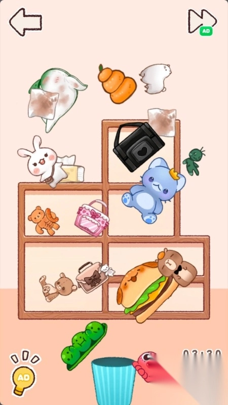 3、需合理规划时间,以高效达成收纳任务。当碰到不知该置于何处的物品时,可适时借助提示道具,获取放置线索,从而顺利通关。