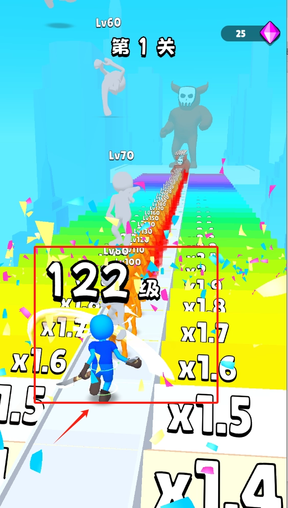 3、操控角色在色彩斑斓的跑道上前行,战胜前方等级为Lv70的敌人与怪物来实现升级。屏幕会呈现当前等级、分数以及伤害倍数,通过收集碎片增强战斗力。