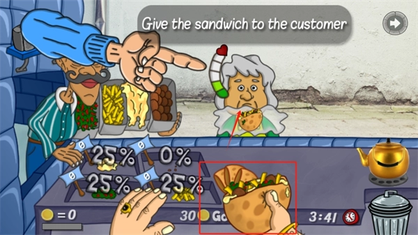 5、制作完成的三明治,直接点击人物,就能把三明治打包交给顾客。