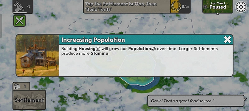 1在一场意外事件后,玩家将扮演幸存者逃到户外,通过点击 “定居 ”按钮来建立营地,努力想办法生存下去。