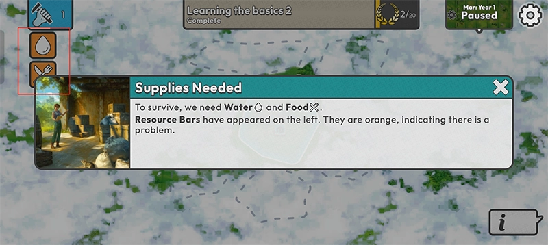3、生存所需,水与食物不可或缺。此时,左侧出现资源条,呈橙色,意味着出现了问题。