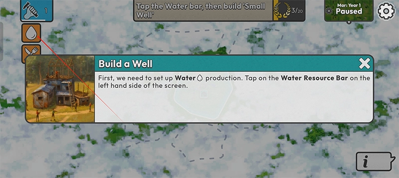 4、首先建造一口水井,点击屏幕左侧的水资源栏。
