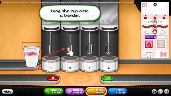 3、多任务操作:针对大厅的新顾客,要在圣代杯中添加冰淇淋与糖果,同时留意搅拌机中的材料,适时添加各类材料及糖浆等。