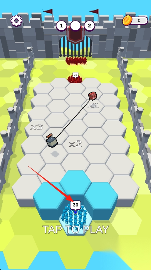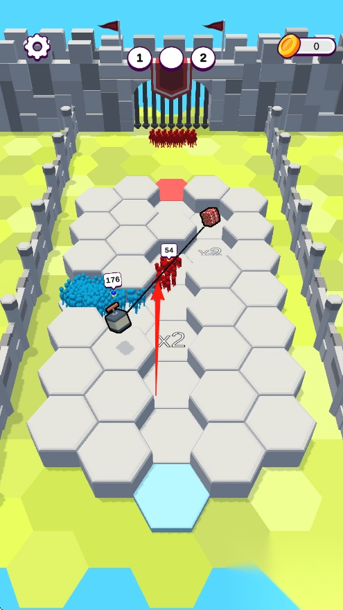 3、推进关卡,占领关键格子(如增益格),积累部队数量,向城堡据点进攻,突破敌方防线。