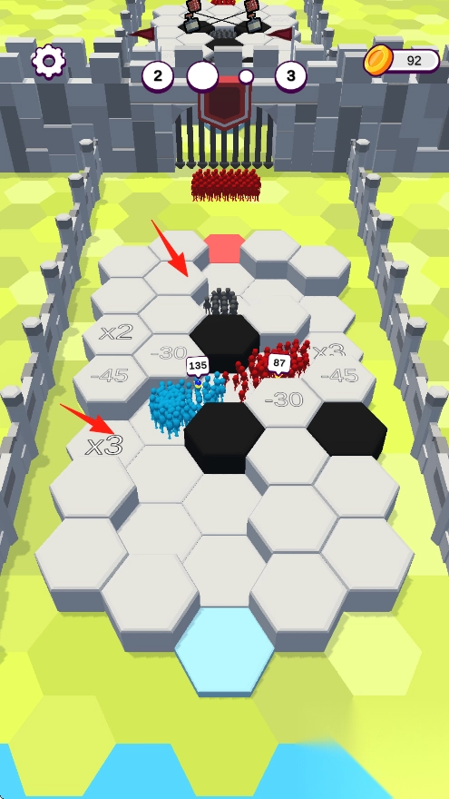 2、部队移动至敌方所在格,自动触发战斗,利用数量优势、格子增益(x2/x3),消灭敌人。