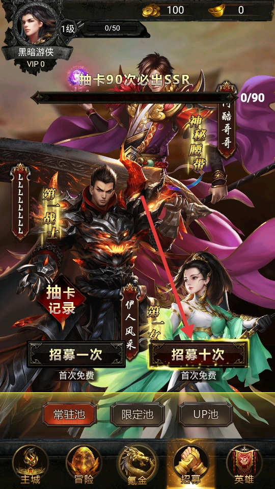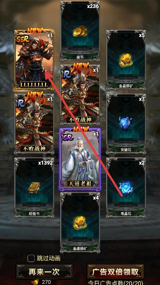 1、开局先薅20次广告羊毛,十连抽攒够元宝再双倍领取SSR。