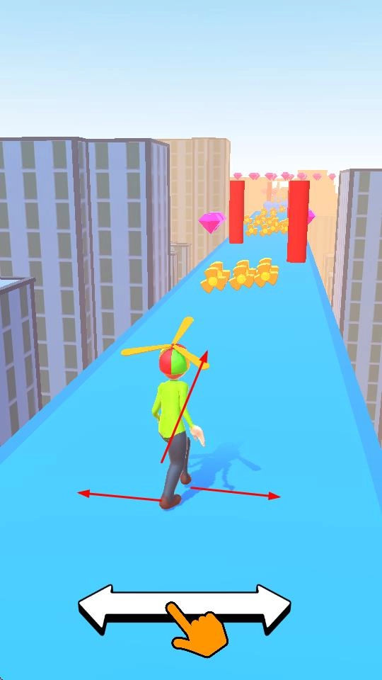 2、在赛道行进过程中,角色会获得螺旋桨道具,利用螺旋桨的飞行能力,越过红色障碍物,继续收集道具,提升游戏成绩。