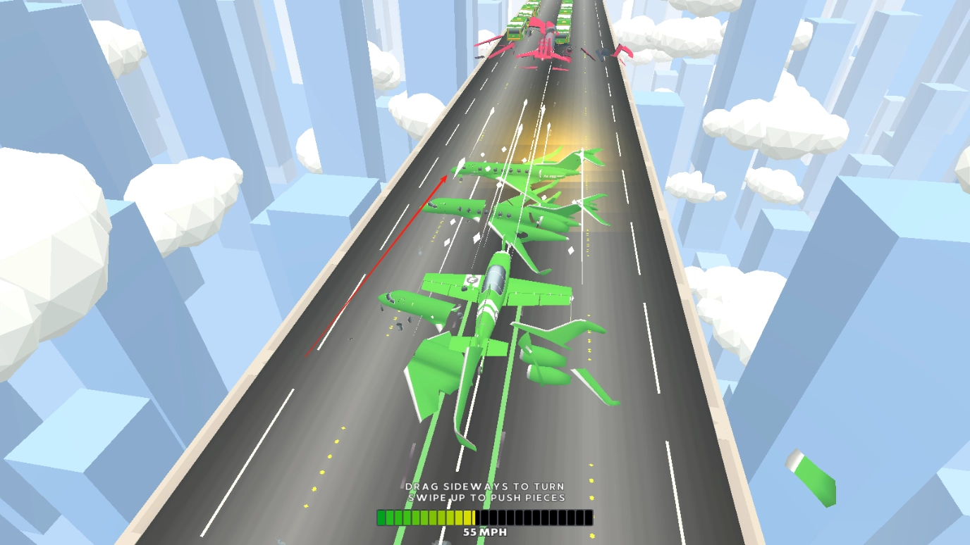 1、飞机在跑道上开始滑行,根据箭头提示向上滑动,飞机会往前冲刺一段距离,撞击前方障碍物,左右滑动控制飞机的方向。