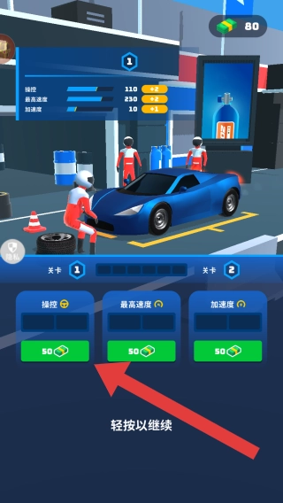 3、展示赛车改装或升级界面,此界面包含操控、最高速度、加速度这三项能够升级的属性。每次对其中一项进行升级,都需要消耗50资源。该界面重点聚焦于赛车属性的提升以及竞速玩法。