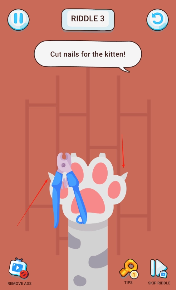 1、根据问题描述,将旁边的指甲钳拖动到猫爪旁边,将猫爪锋利的指甲都剪掉就好,放小猫抓鱼。