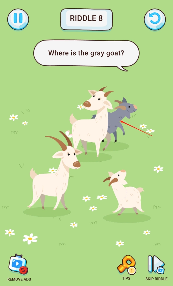 2、根据问题描述寻找灰色小羊,将白色小羊挪开,灰色小羊躲在白色小羊后面,再点击一次就可以进入下一关。