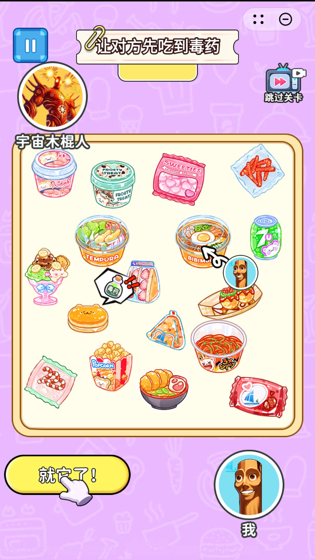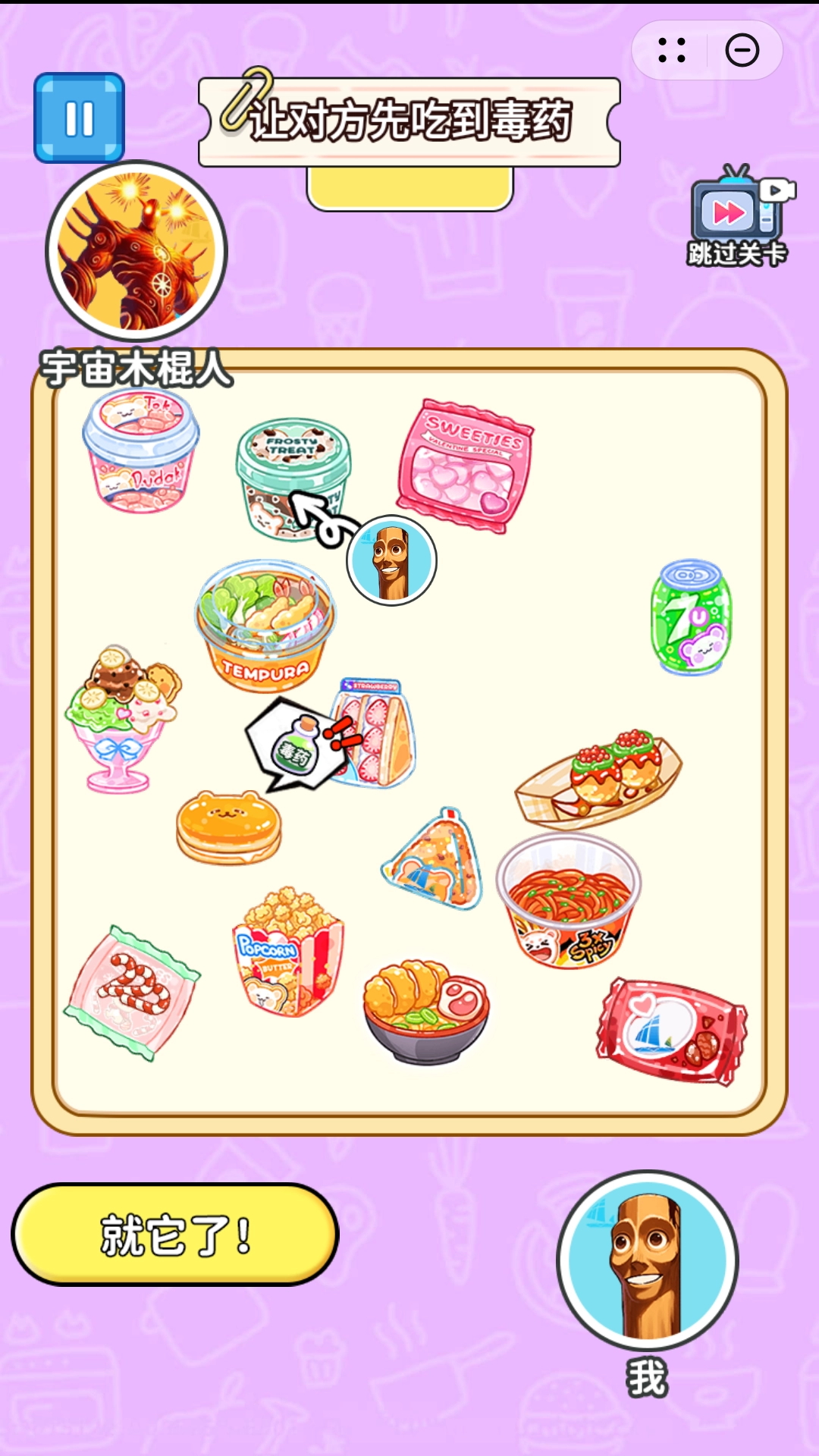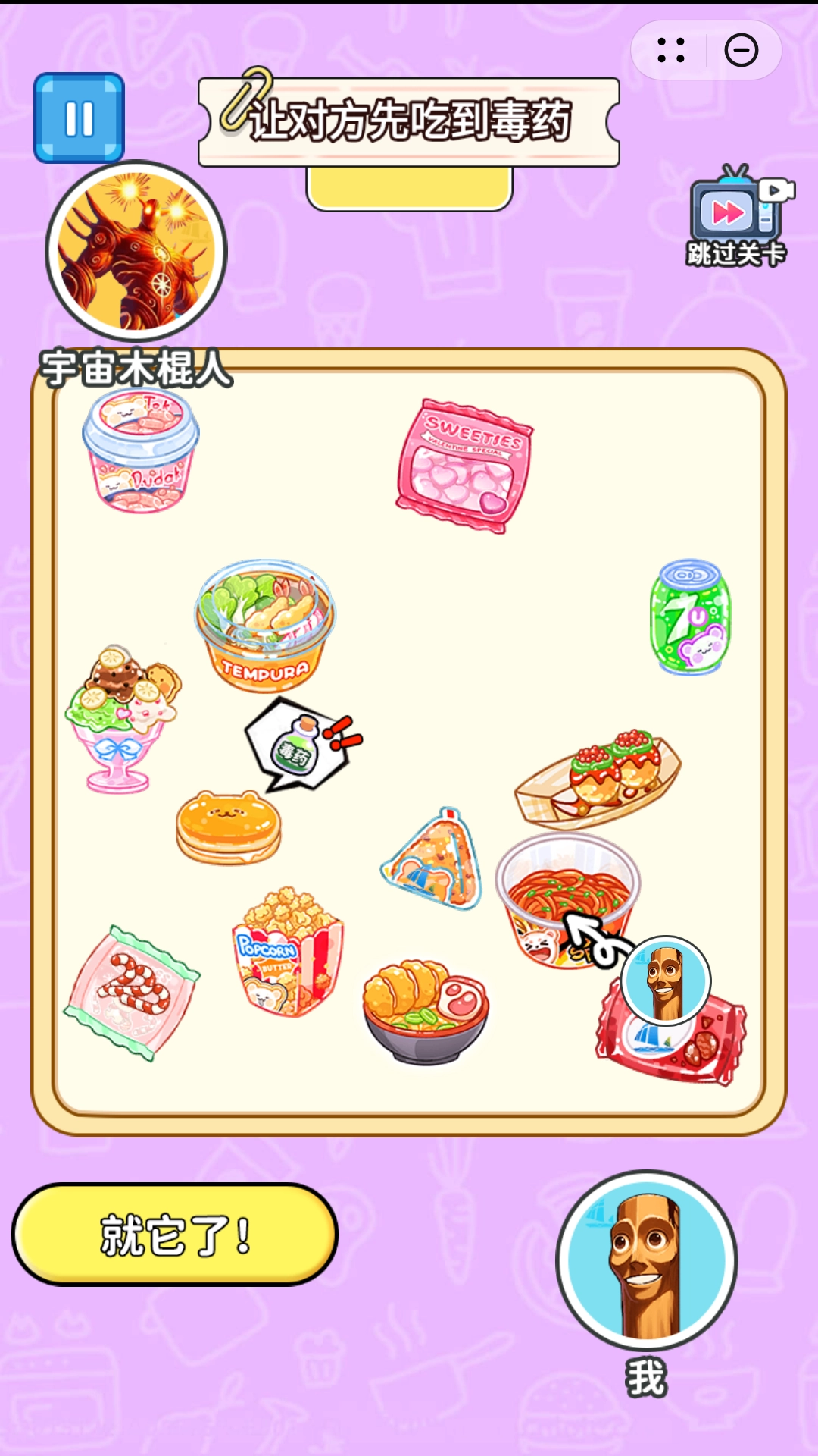 3、进入关卡后,可选择让对方先吃到毒药之类的操作,挑选对应的物品,接着点击“就它了”按钮,与物品展开互动,以此完成关卡的互动挑战。