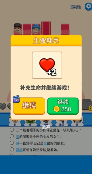 4、当生命值耗尽,若想继续游戏需进行补充,此时可选择用金币购买,也能观看广告视频来实现。