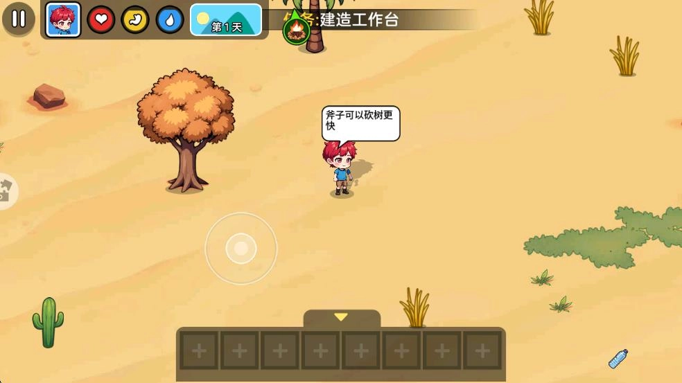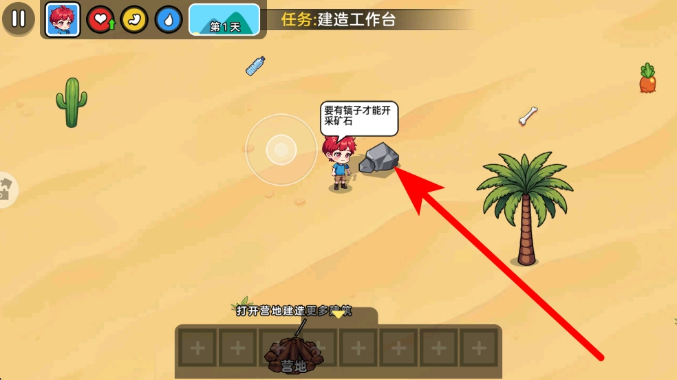 3、在进行收集建设时,进入沙漠承接搭建工作台等任务,过程中要留意石头、胡萝卜这类资源,依照提示展开收集工作,利用收集到的资源来建造营地建筑,通过完成任务提高生存几率。